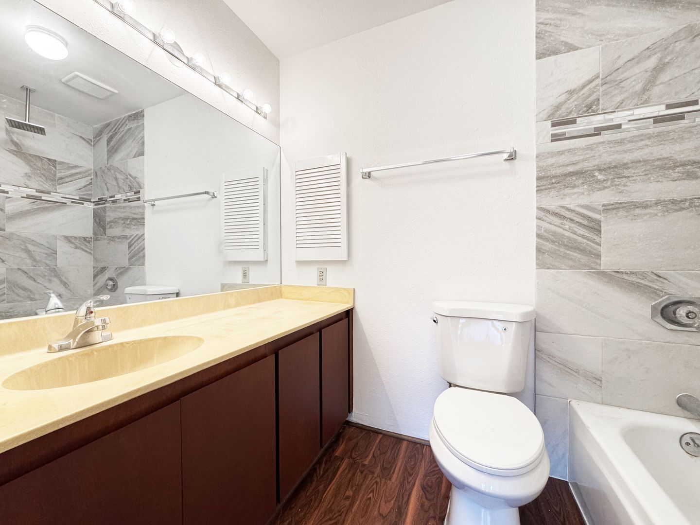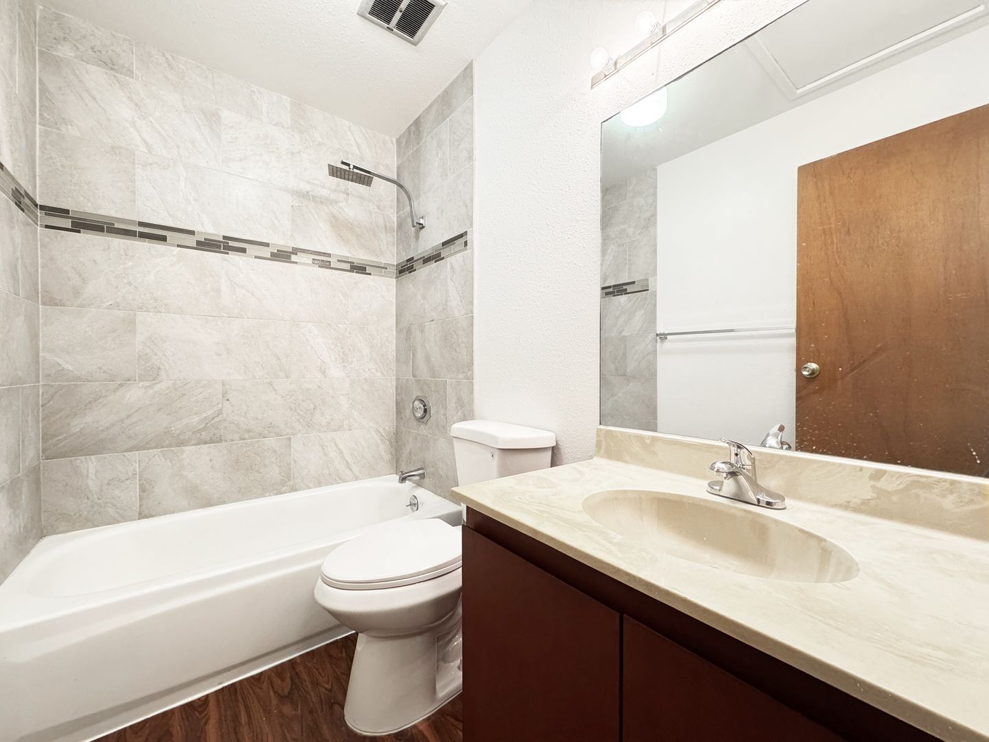 The recently painted three-bedroom, two-bathroom townhouse has easy to clean vinyl plank flooring, stainless steel appliances, a one-car garage, and one open parking space.
